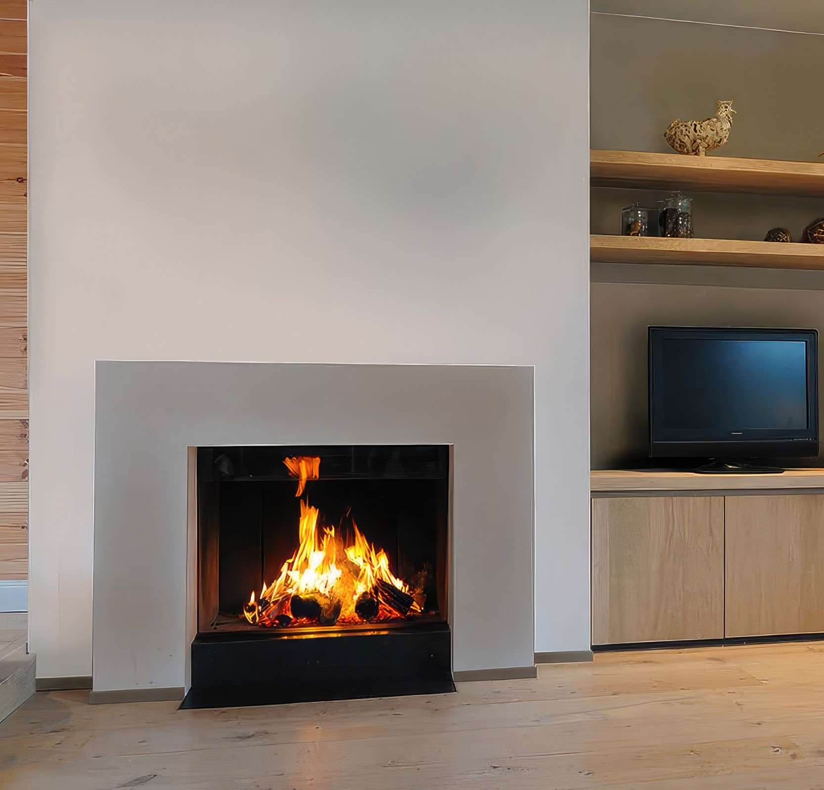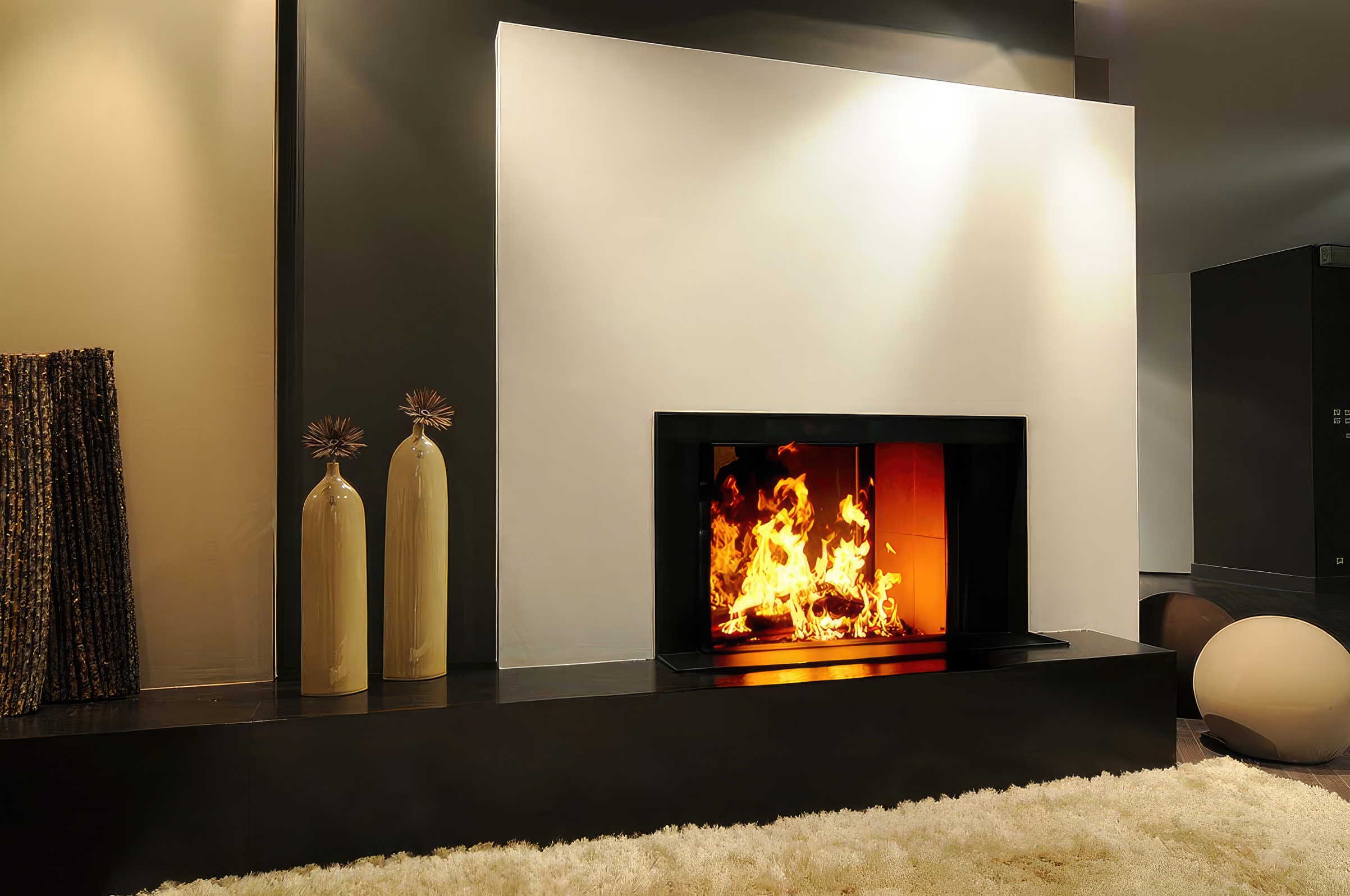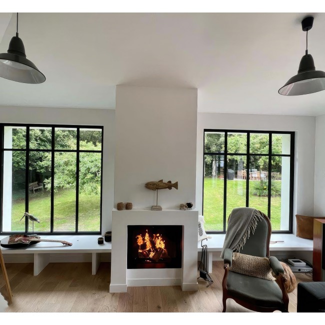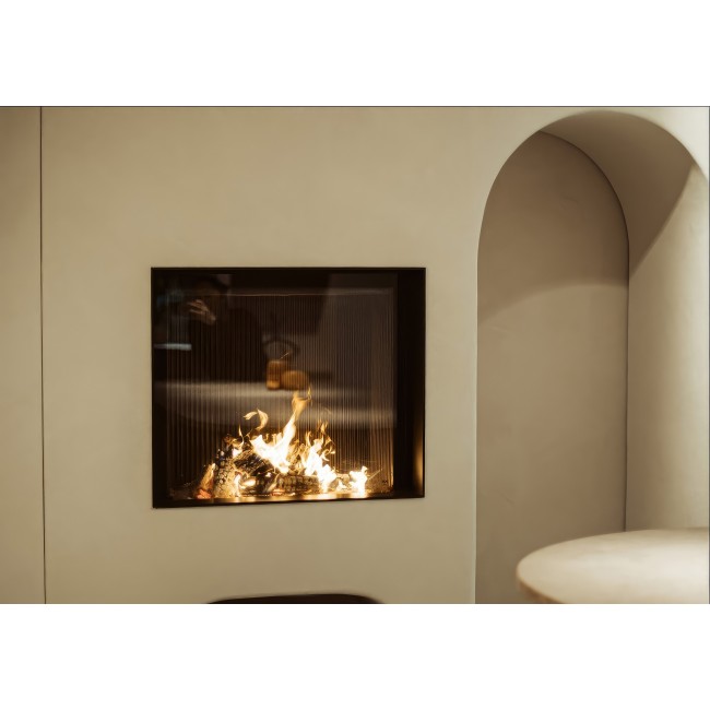 Эстетика Pure Face: Безрамочная конструкция позволяет интегрировать топку в стену так, что видимым остается только стекло и живое пламя.