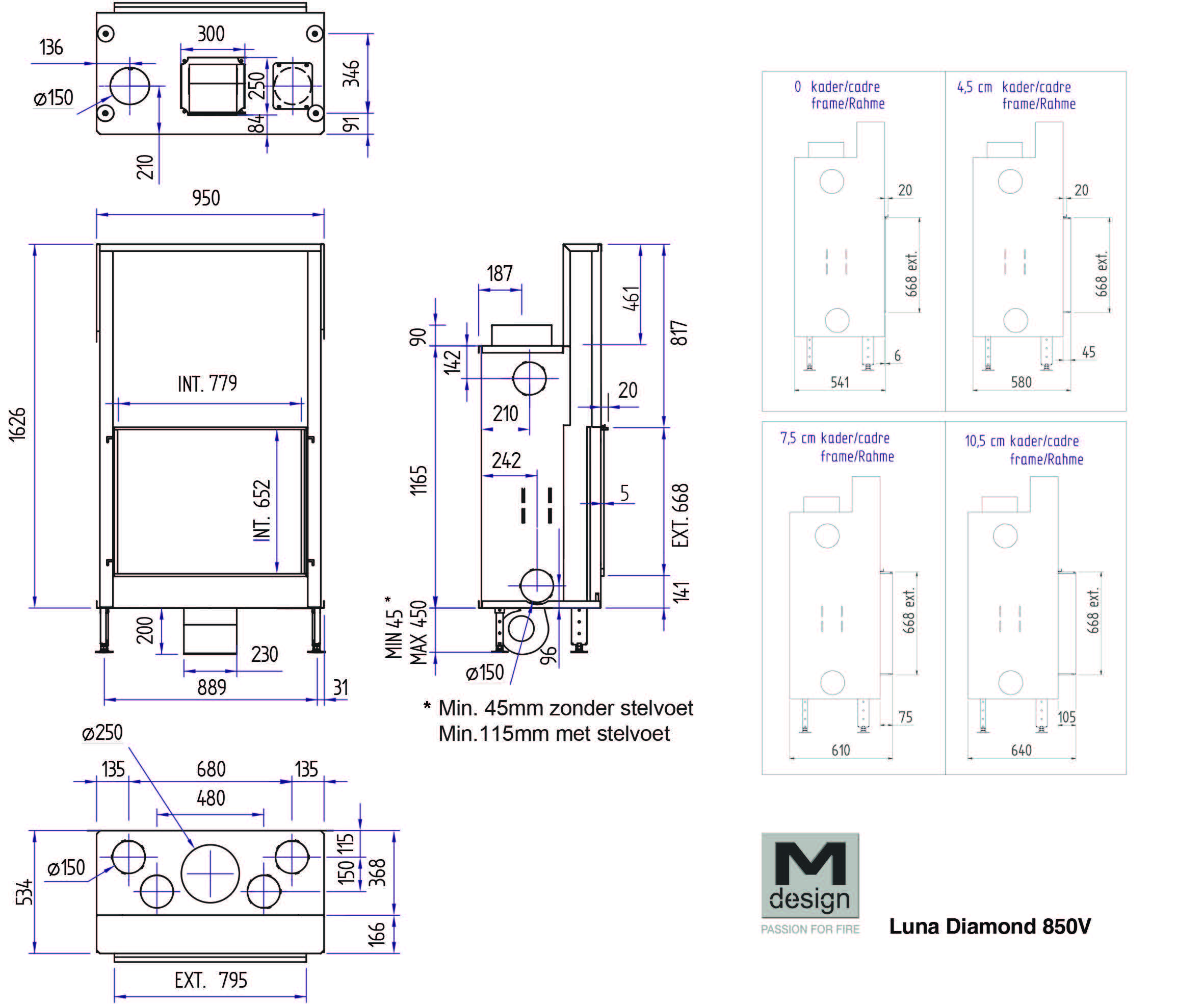 Чертеж: На схеме важно отобразить габаритную ширину 950 мм (вместе с направляющими) и глубину 586 мм. Высота более 1.7 метра требует высокого потолка для размещения дымоходного колена.