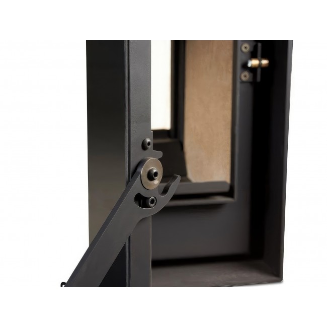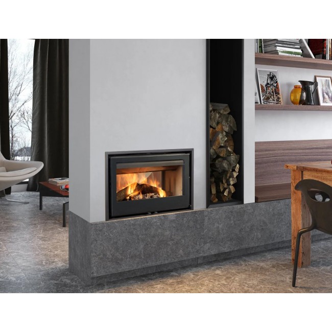 Подходит для модерного стиля, встроенной двусторонней установки. Размеры позволяют вписать в стену шириной 1 м. Сертифицирована по европейским нормам (низкие выбросы CO ~41–109 мг/Нм³, температура дымовых газов ~200–300°C). Рекомендуется профессиональная установка с учетом норм пожарной безопасности.