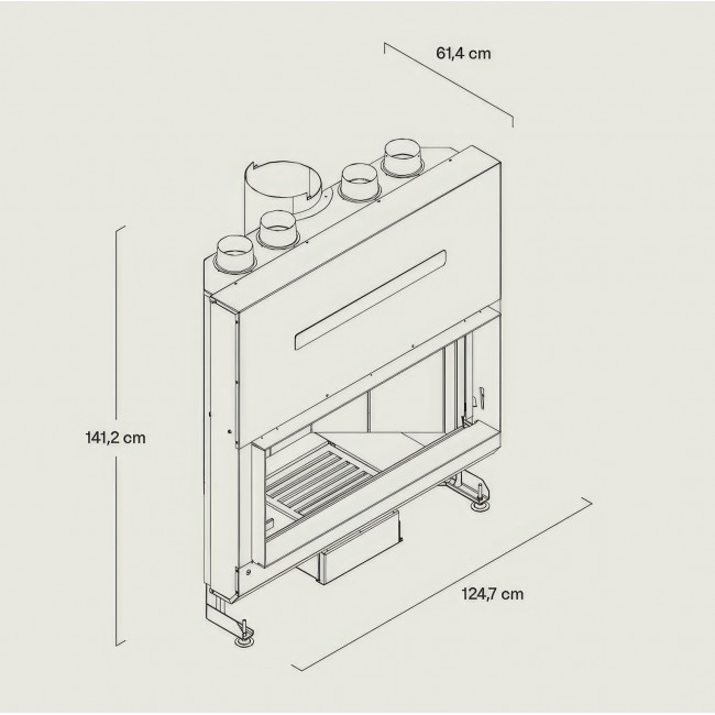 Топка выполнена из прочной стали, имеет надёжную конструкцию и рассчитана на долгий срок службы. Размеры 122 × 137 × 63 см и вес около 290 кг делают её подходящей для установки в просторных гостиных и загородных домах. Использование дров в качестве топлива обеспечивает экологичность и доступность эксплуатации, а удобный доступ к топке упрощает уход и обслуживание.