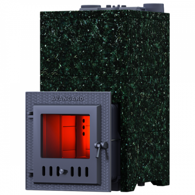 Облицовка из плит Пироксенита - эффектное и красивое обрамление банных печей "Авангард". Хорошо отполированные чёрные блестящие плиты Пироксенита с искрящимися вкраплениями зелёного цвета делают печь главным украшением парной и создают идеальный микроклимат русской бани. Облицовка регулирует уровень нагрева парной, останавливает конвекцию, сохраняет уровень влажности и останавливает жёсткое инфракрасное излучение. Этот камень нагревается постепенно, а потом на протяжении долгого времени равномерно излучает мягкое тепло.