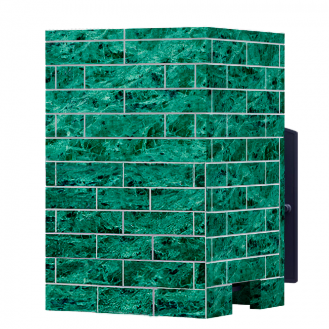 Облицовка из кирпичиков змеевика - это простой и эффективный способ создать режим русской бани. Облицовка представляет собой плитки зелёного камня с краями, обработанными фаской. Из-за этих краёв облицовка имеет чёткий рисунок, который полностью имитирует настоящую кирпичную кладку. Эта облицовка также, как и облицовка из классического кирпича, останавливает жёсткое инфракрасное излучение и конвекцию, легко собирается/разбирается и не требует никаких специальных навыков при сборке.