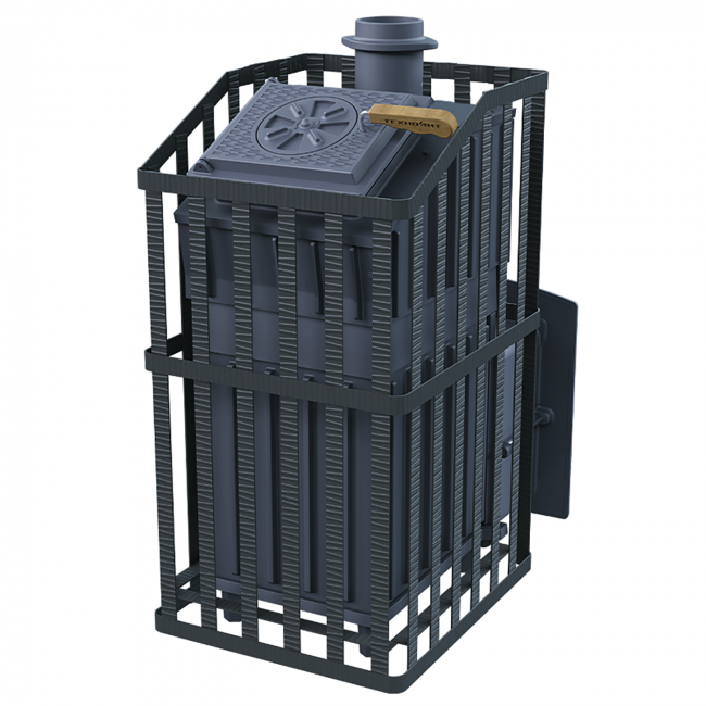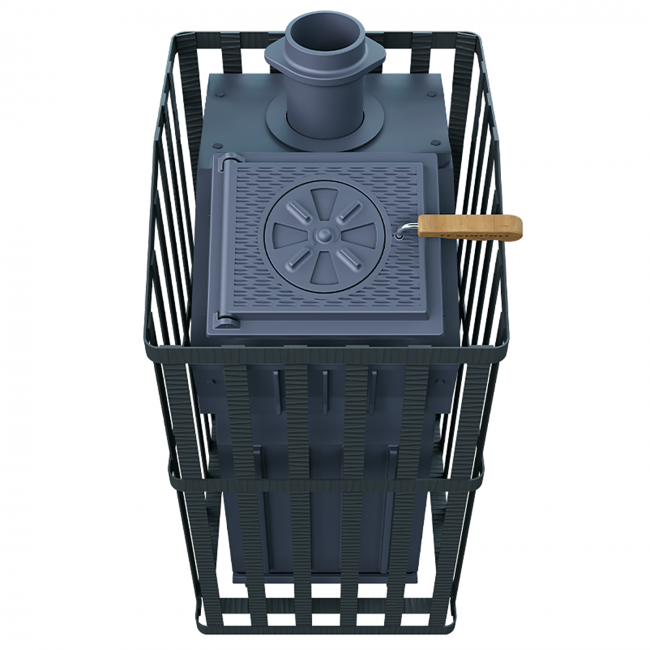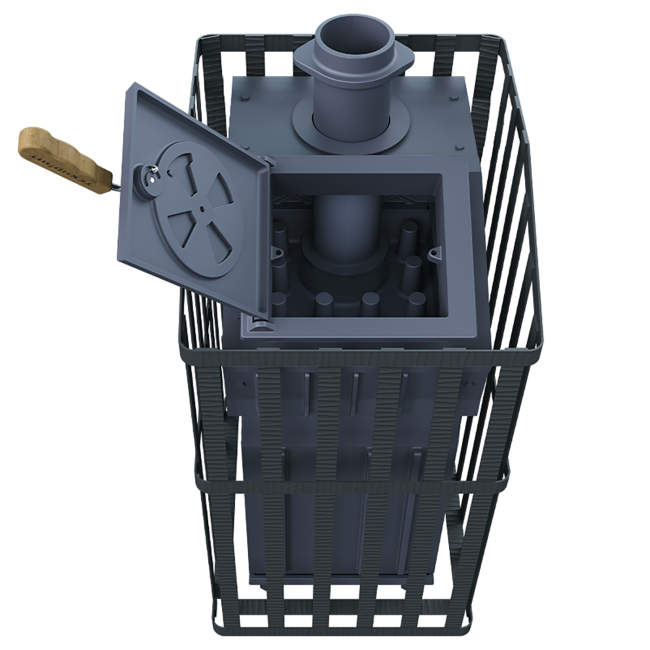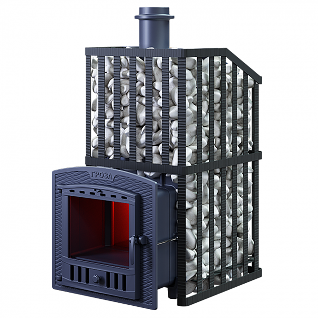 Печь для бани GROZA 24 (П)2 Ураган - расширенный комплект печи в сетке. Максимально приближенный вариант печи для режимов русской парной, имеющий непосредственно закрытую чугунным коробом каменку, дверцу для пара с ручкой из бука, увеличенную до 50 см чугунную стартовую трубу. Печь легко модернизируется до полноценной печи предназначенной для Русской бани путем замены стальной сетки на каменную облицовку без демонтажа дымохода.