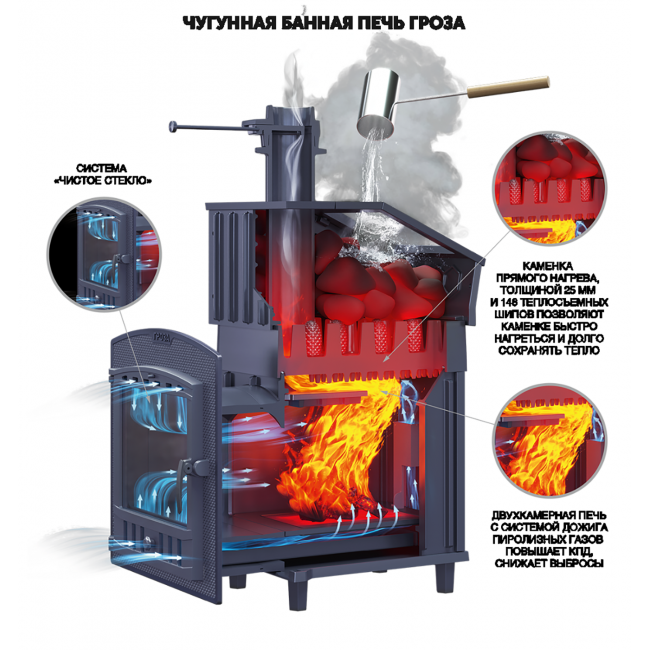 Печь GFS Гефест Гроза с уникальной каменкой прямого нагрева для получения легкого мелкодисперсного пара, необходимого для режима русской бани. Благодаря инновационной конструкции, печь гарантированно входит в режим за 60 минут.