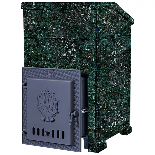 Комплект GFS Гефест ЗК 25 Президент 980/40 Пироксенит - печь с усиленной каменкой большей массы, с единым углублением внутрь топки для дополнительной укладки чугунного заряда. Теплосъемные шипы со стороны горения пламени в разы увеличивают площадь соприкосновения огня с каменкой и ускоряют передачу тепла, а также способствуют лучшему дожигу, смешивая потоки пламени и воздуха, поступаемого из воздушника. Эти усовершенствования значительно повышают мощность парообразования печи и выдают большее количество пара при непрерывной подаче воды. Каменка печей GFS Гефест-ЗК является незаливаемой.