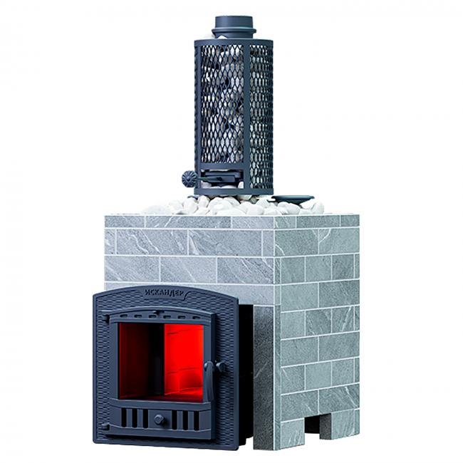 Печь Искандер получила от старших моделей парообразователь прямого нагрева - чугунную каменку имеющую существенную толщину и массу для аккумуляции тепла. Нагреваясь свыше 600С она эффективно нагревает дополнительный заряд, и при попадании воды даёт лёгкий мелкодисперсный пар. Расположенные снизу теплосъёмные шипы ускоряют нагрев парообразователя.