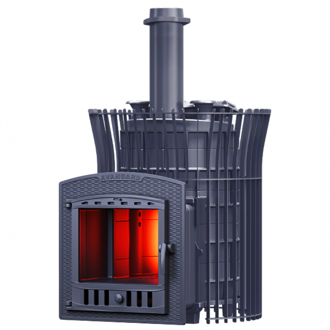 Масса пароиспарителя в печи AVANGARD 51 кг, и он нагревается прямым контактом с пламенем. У пароиспарителя 2 поверхности с увеличенной рабочей площадью – снизу идёт нагрев огнём, а сверху поддаётся вода для пара. У печи уникальная, массивная каменка с теплонакопительными воронками, для получения легкого пара.