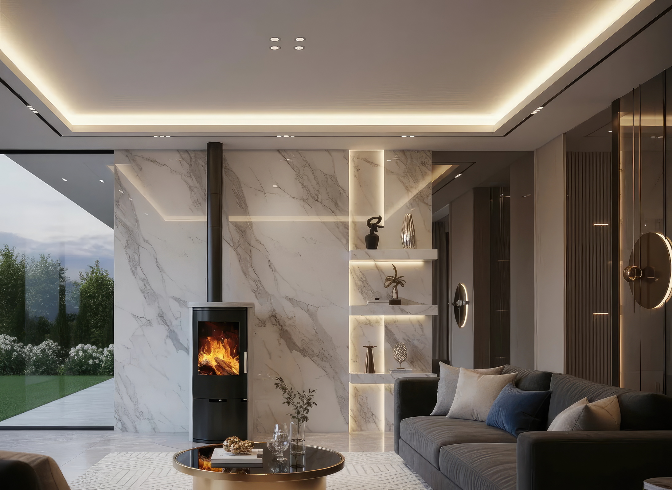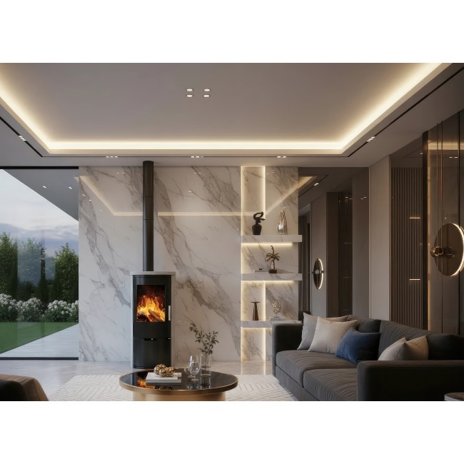 Печь-камин Ember E14 Limestoneв камне — это высокопроизводительное отопительное решение для тех, кто ценит современный дизайн и надежность. Благодаря увеличенной камере сгорания и внушительной высоте (свыше 1100 мм), эта модель становится доминирующим элементом интерьера, обеспечивая при этом полноценный прогрев просторных помещений.