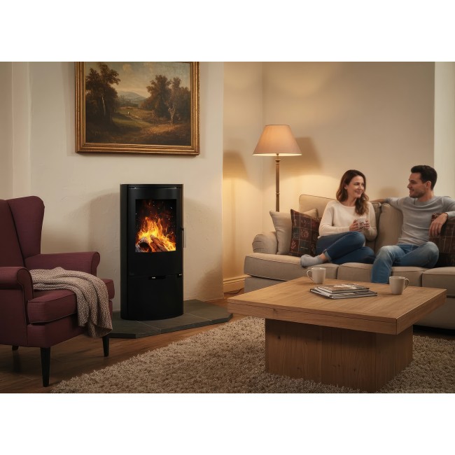 Корпус выполнен из котловой стали с термостойким покрытием. Топка футерована вермикулитом высокой плотности, что обеспечивает чистое сгорание и защищает сталь от прямого воздействия огня. Модель поддерживает подключение внешнего воздуха (CPV), что критически важно для домов с принудительной вентиляцией или высокой герметичностью.