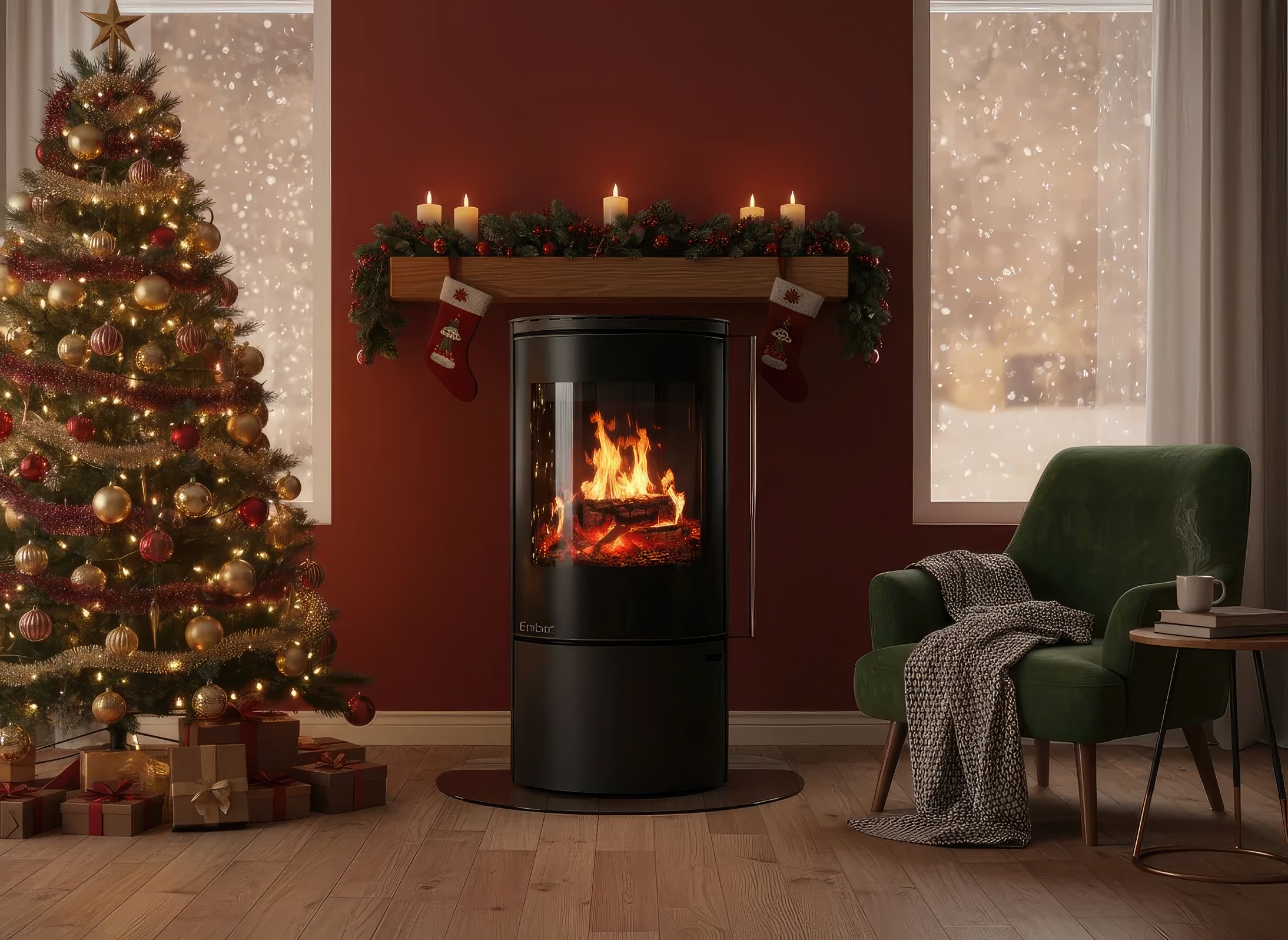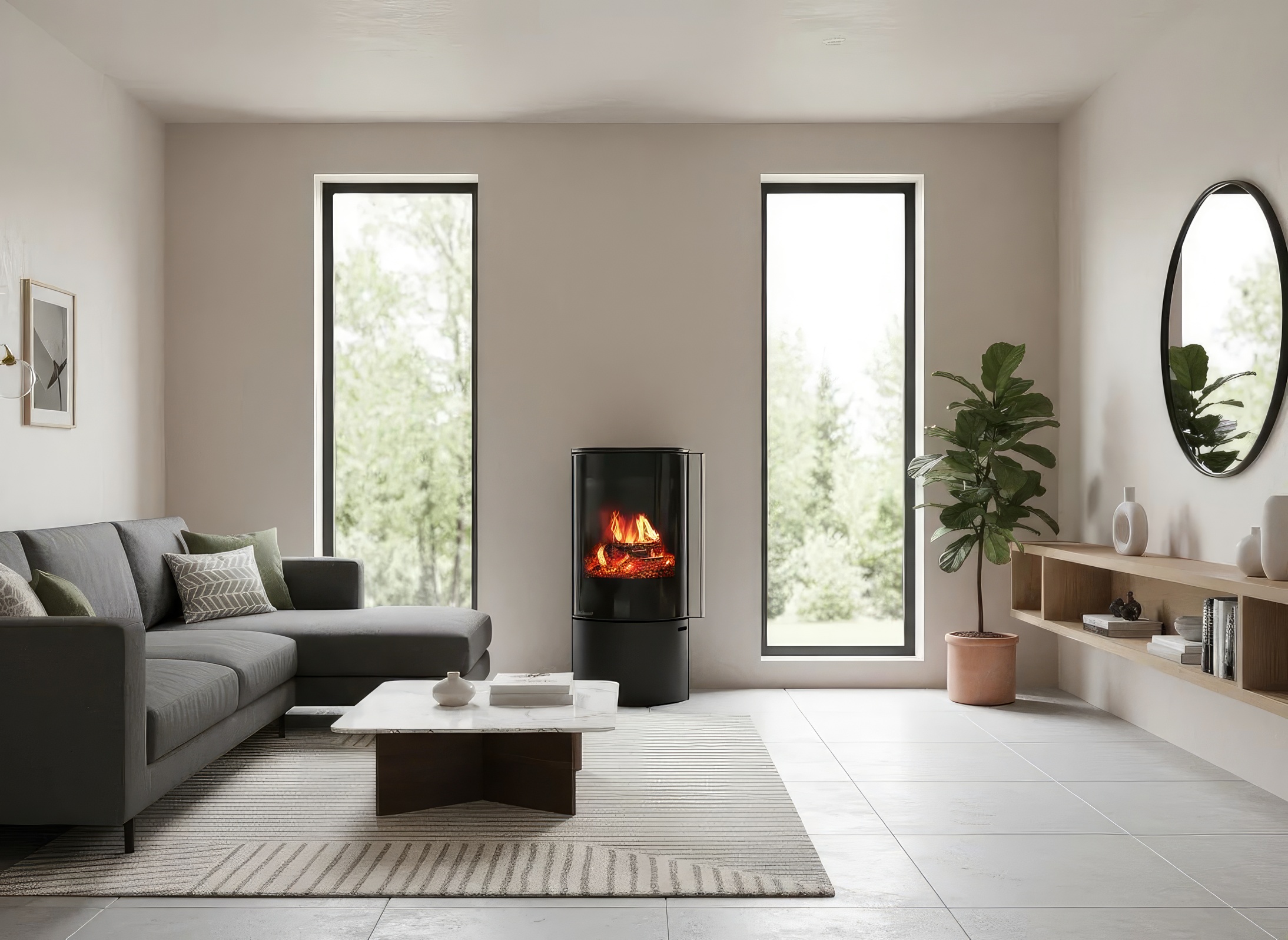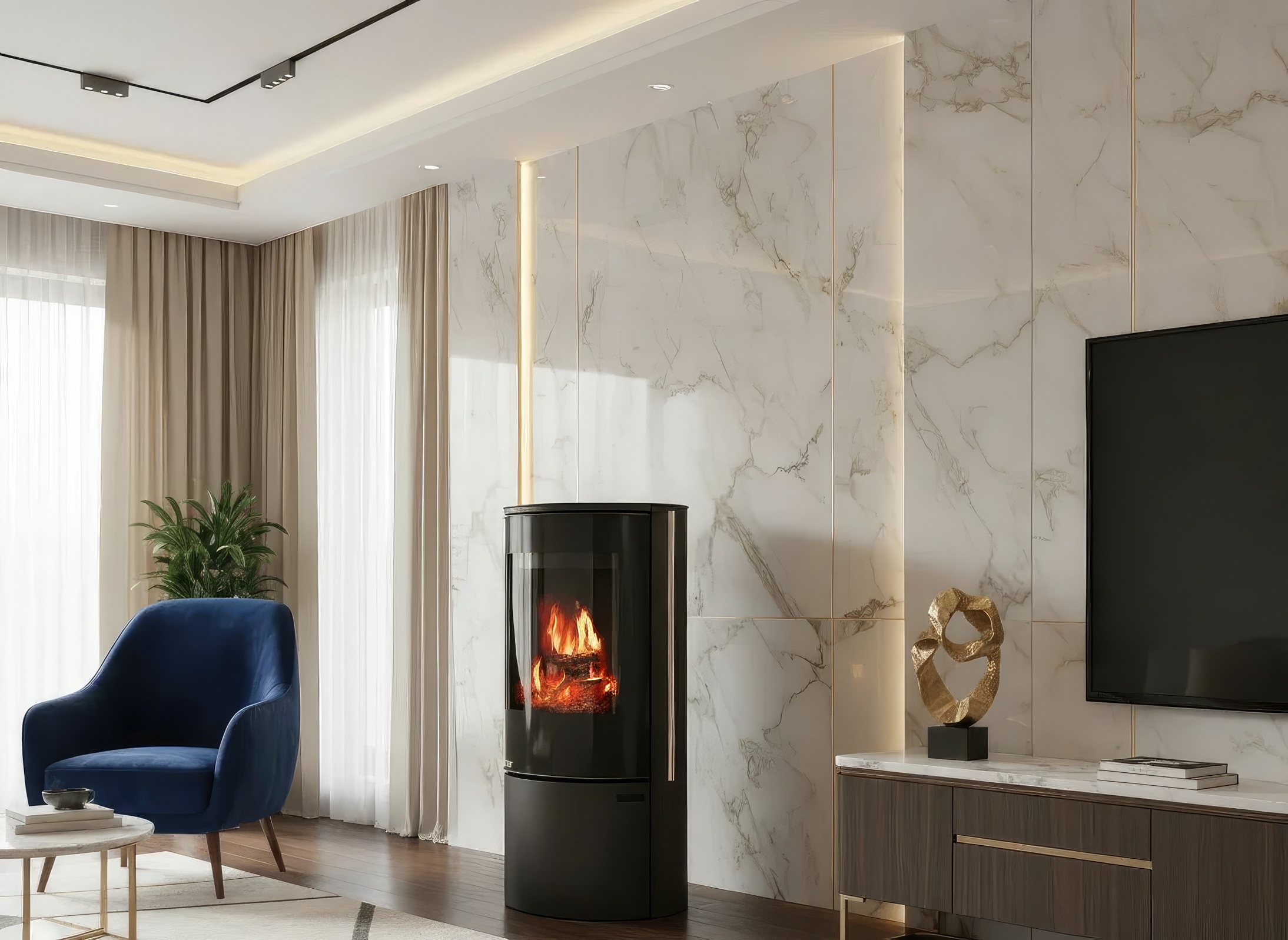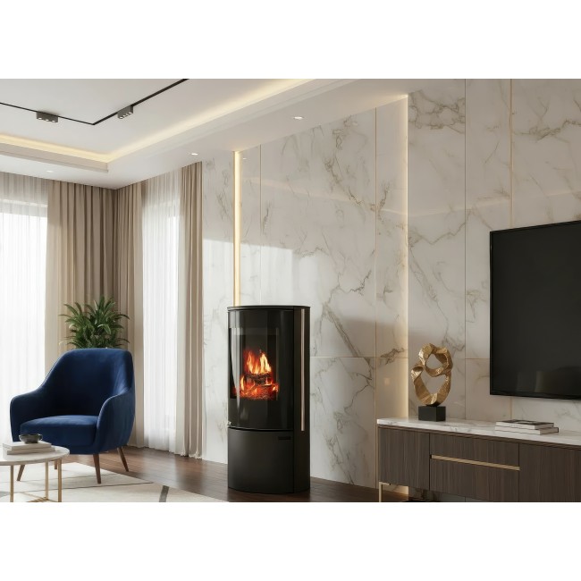 - Панорама Full Glass: Цельностеклянный фасад с черной шелкографией визуально расширяет границы пламени, скрывая технические детали дверцы.
