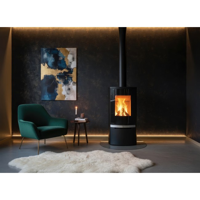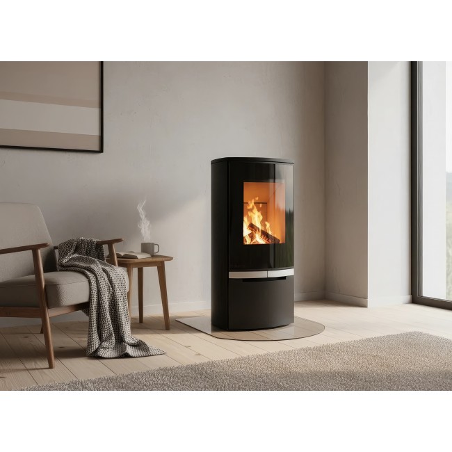 Внутренняя отделка выполнена из светлого вермикулита, который не только защищает сталь, но и за счет отражения тепла повышает температуру сгорания, делая пламя более ярким и чистым. Система «Чистое стекло» в модели U2 FG работает на обе стороны фасада, поддерживая прозрачность панорамного обзора даже при длительной топке.